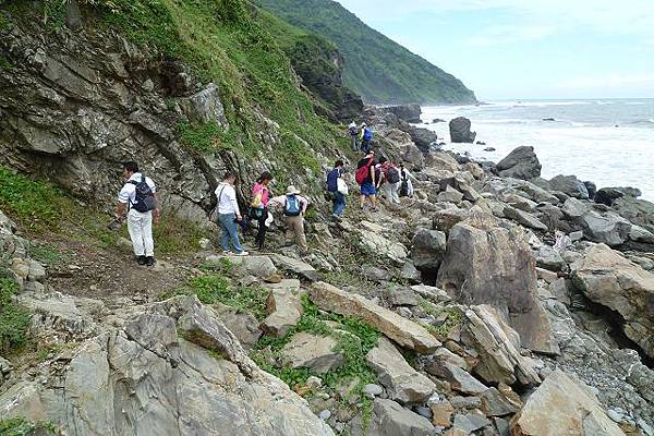 架繩組已先行出發,偶跟上淨灘組,由志工一路帶領並解說生態樣貌。”阿朗壹古道”現今路段由達仁南田段往南越過觀音鼻進入牡丹旭海段,全長約12公里。隊伍由南往北沿岸而行,雨勢稍歇但是海風強勁,轉入卵石區成千成萬的南田石佈滿海岸線,走踏石灘還挺費腳勁的,但傾耳就能聽著海濤捲浪的夢幻之音,真是美妙
